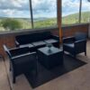 Tekstura ratana i ravni nasloni za ruke, kao i ploča stola od rezolita naglašavaju jedinstveni karakter garniture.